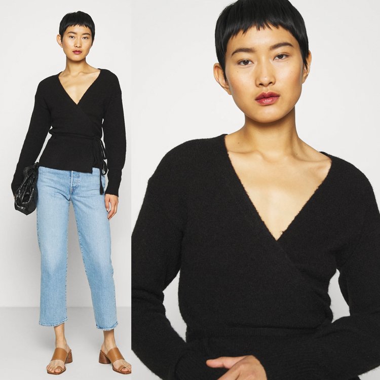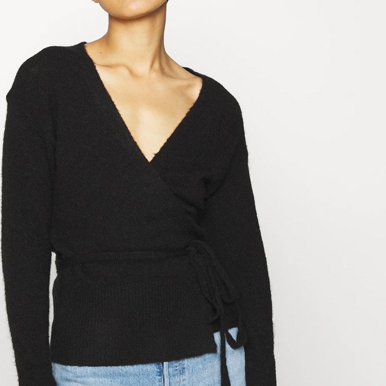 Wiązany, kopertowy sweter z przyjemnej, miękkiej i ciepłej dzianiny z dodatkiem wełny. Rękawy długie wykończone ściągaczem, dekolt V, dopasowanie regulowane wiązaniem.