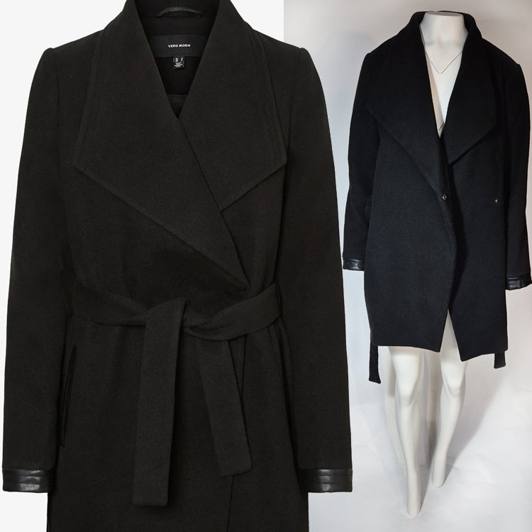 Elegancki czarny płaszcz damski VERO MODA o długości do uda. Ponadczasowy fason z asymetrycznym, kopertowym zapięciem oraz szerokimi klapami. Model posiada pasek w talii, pozwalający dopasować płaszcz do figury, oraz praktyczne kieszenie wykończone subtelnymi detalami z imitacji skóry – identyczne wykończenie znajduje się również przy mankietach rękawów. Wewnątrz wykończony podszewką.