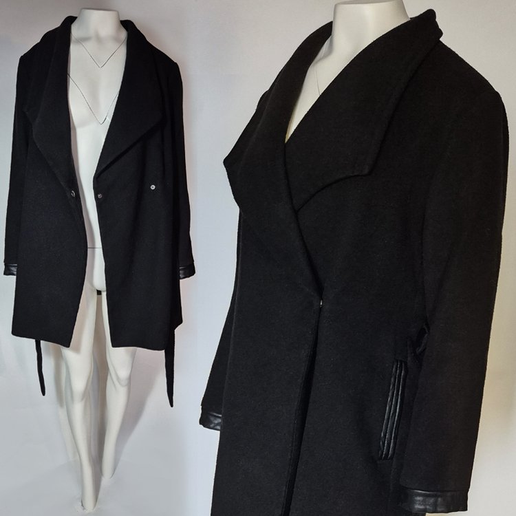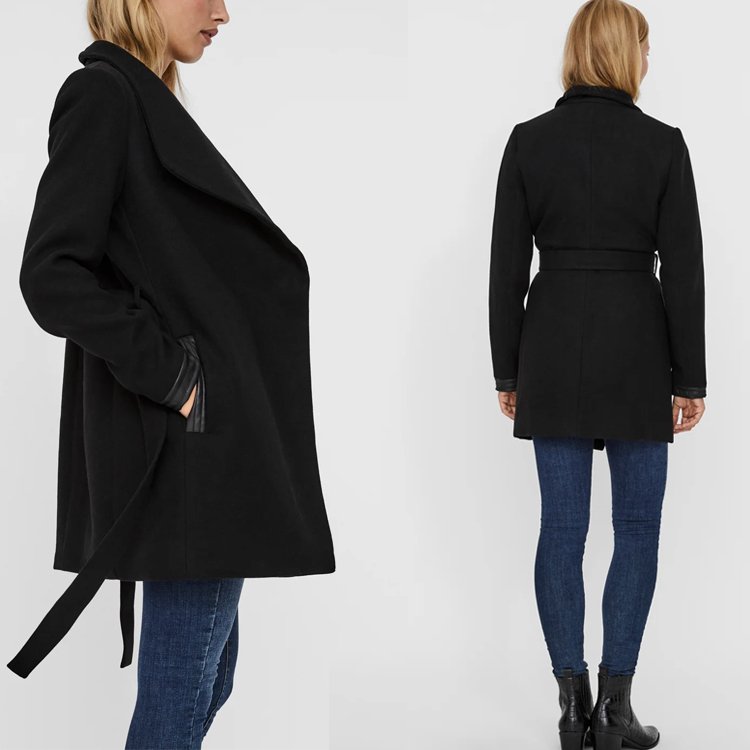 Elegancki czarny płaszcz damski VERO MODA o długości do uda. Ponadczasowy fason z asymetrycznym, kopertowym zapięciem oraz szerokimi klapami. Model posiada pasek w talii, pozwalający dopasować płaszcz do figury, oraz praktyczne kieszenie wykończone subtelnymi detalami z imitacji skóry – identyczne wykończenie znajduje się również przy mankietach rękawów. Wewnątrz wykończony podszewką.