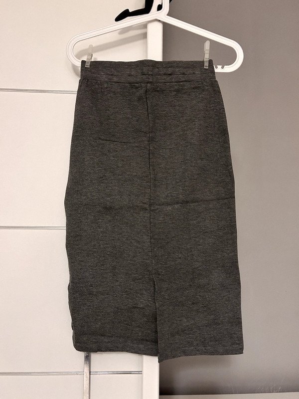 Spódniczka marki 365, rozmiar z metki to XS 34. Ma bardzo wysoki stan, posiada sznureczki w talii, Dzięki czemu można ją regulować. Z boku ma lampasem, a z tyłu specjalnie rozcięcie, dzięki któremu łatwiej się porusza. To typowa obcisła tubka. Świetnie pasuje do szafy kapsułowej, dzięki temu, że jest szara. Wykonana w 68% z wiskozy.