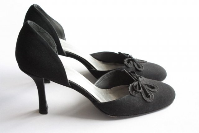 Czarne, na stabilnym obcasie, wierzch z czarnego rypsu, wnętrze skórzane. Skórzana podeszwa.