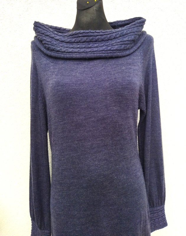 Dzianinowa sukienka w szarym kolorze z dużym luźnym golfem golf i mankiety rękawów z nieco  grubszej włóczki z warkoczowym wzorem. Taliowana ,  wykończona wysokim ściągaczem . Asymetryczna - łukowato podkrojony przód  krótszy od tyłu.