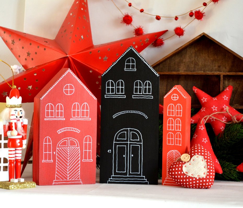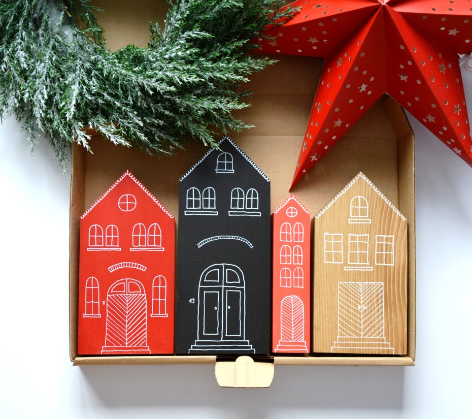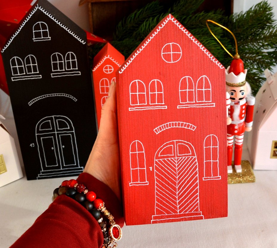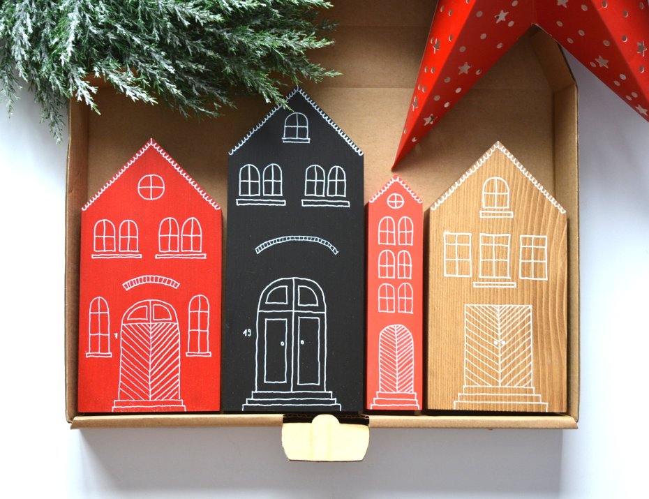 Świąteczne miasteczko w miniaturze - 4 urocze, drewniane domki, ręcznie malowane, każdy w swoim unikalnym stylu: