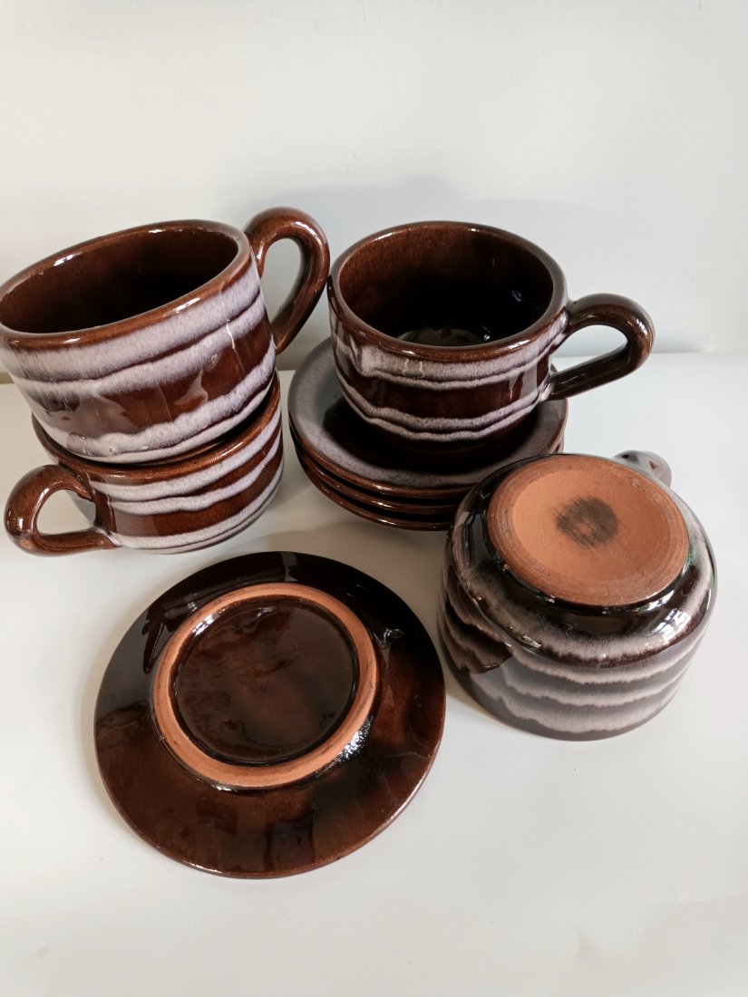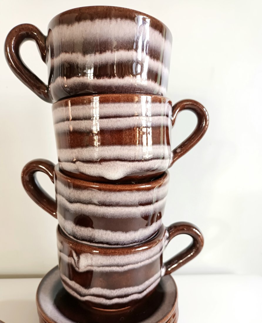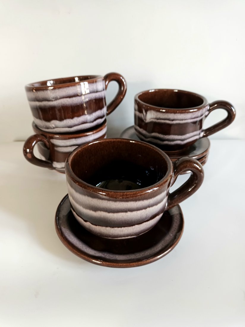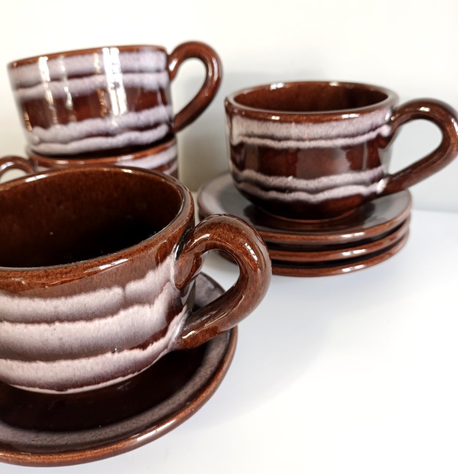 Komplet filiżanek retro / vintage – ceramika brązowa z podstawkami