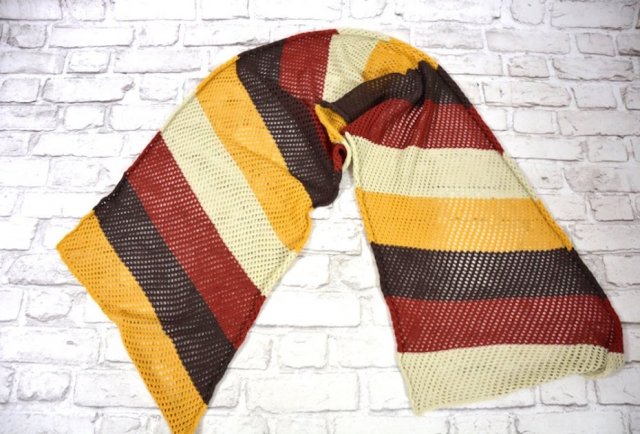 Długi i szeroki czterokolorowy szal ażurowy wykonany z grubszej dzianinki, dominujace kolory : musztardowy, brąz,miedziany, przybrudzona biel.