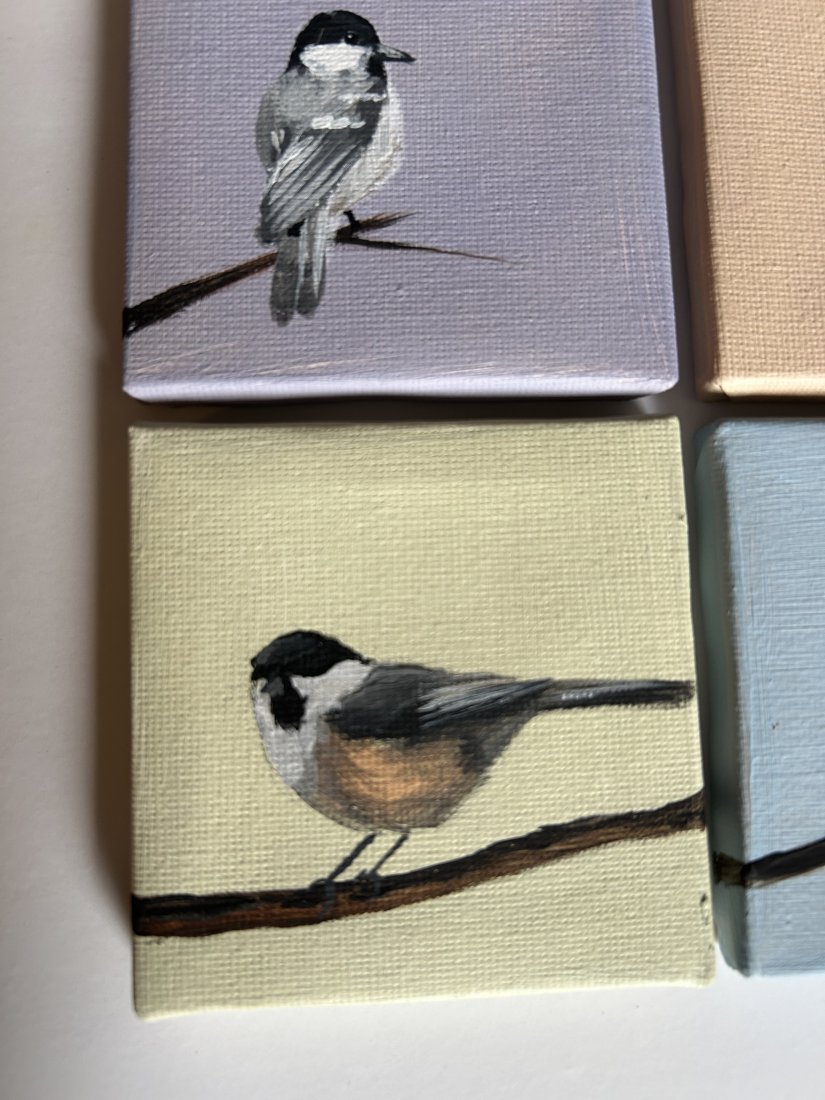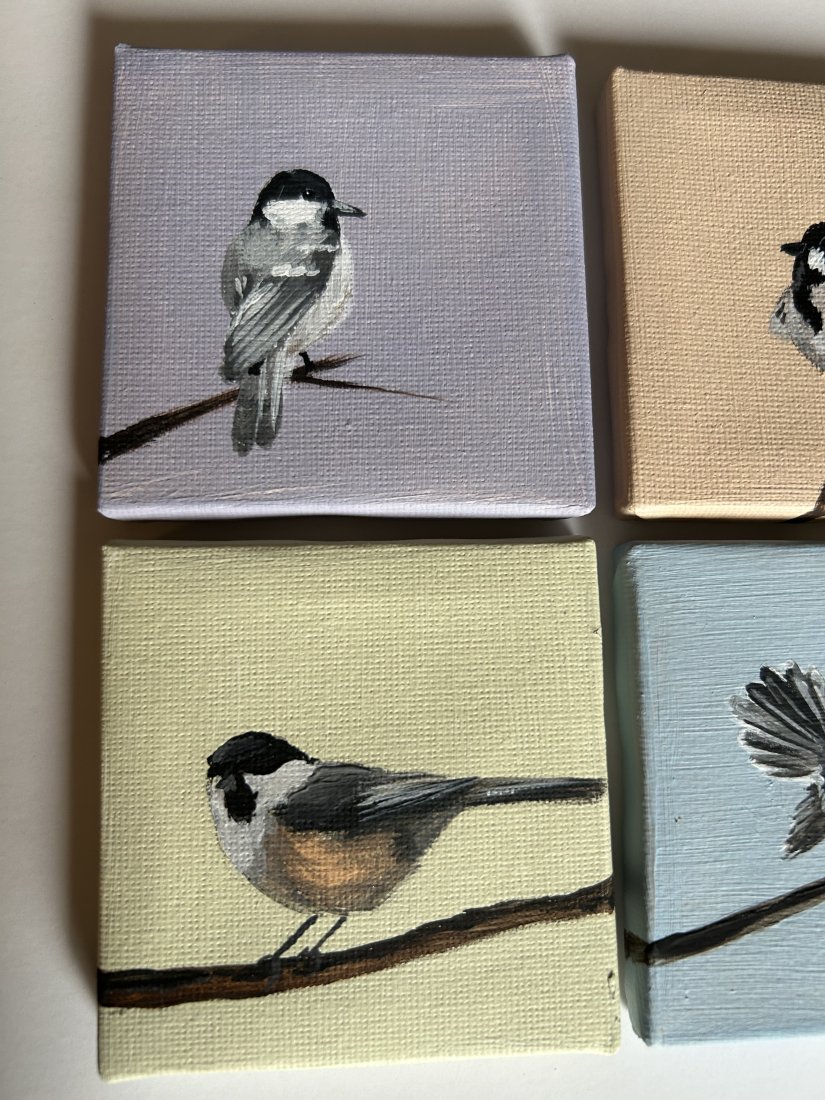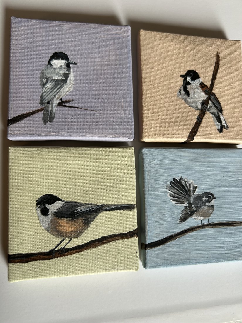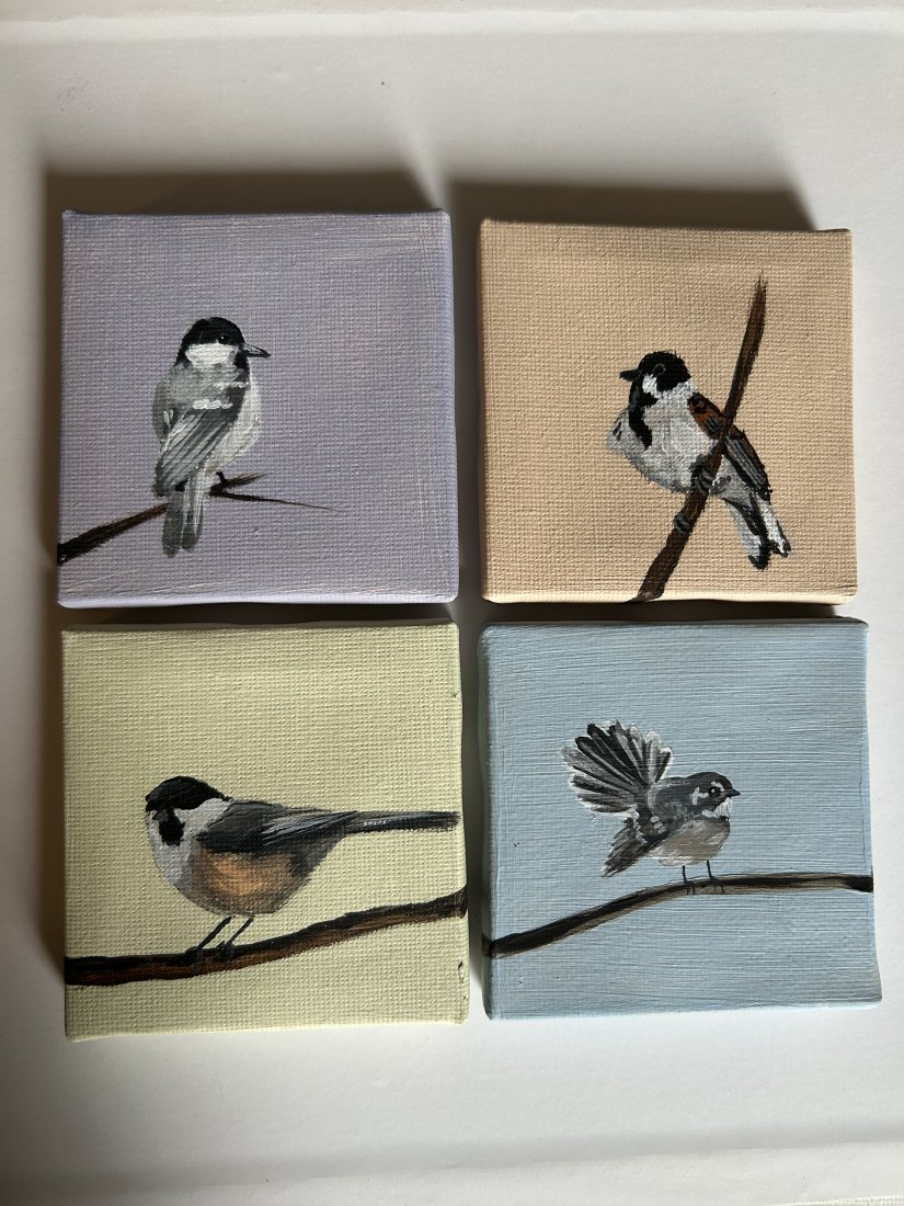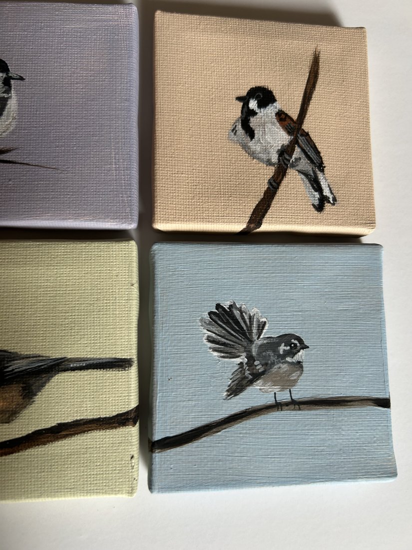 zestaw 4 obrazków ptaszków, ręcznie malowanych farbami akrylowymi, 7x7cm