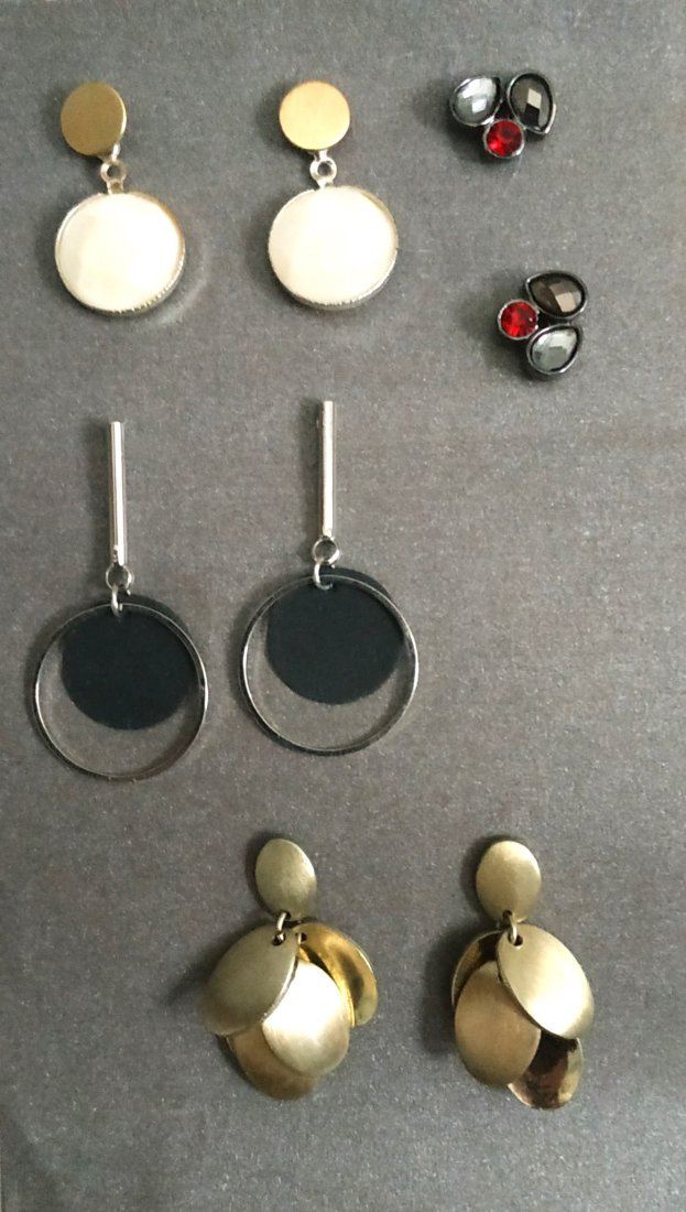 4 pary kolczyków. 1 para wkrętek z czerwonym i szarym oczkiem. trzy wiszące - jasna masa perłowa z matowym złotym sztyftem, który można zmieniać, drobne ruchome listki z matowego złotego metalu oraz czarne koła w oprawie z białego metalu, delikatne.