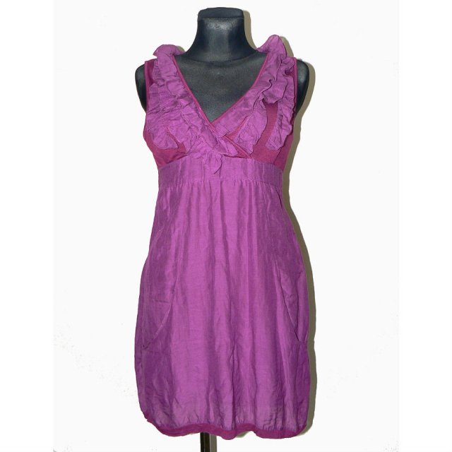 Delikatna sukienka w pięknym biskupim kolorze. Zdobiona falbanami przy dekolcie, spódnica na podszewce, dwie wpuszczane kieszenie.