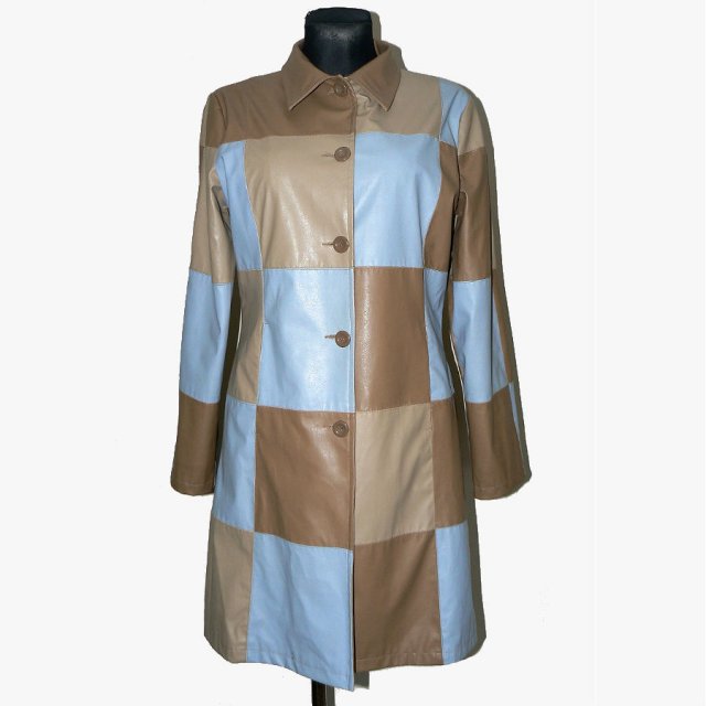 Płaszczyk z miękkiej ekoskórki w niebiesko brązową kratę.