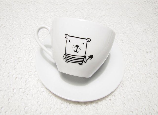 Witaj mój przyszły użytkowniku. Jestem filiżanką o pojemności 400 ml, na której pojawił się miś, malowany ręcznie, farbami trwałymi do ceramiki.