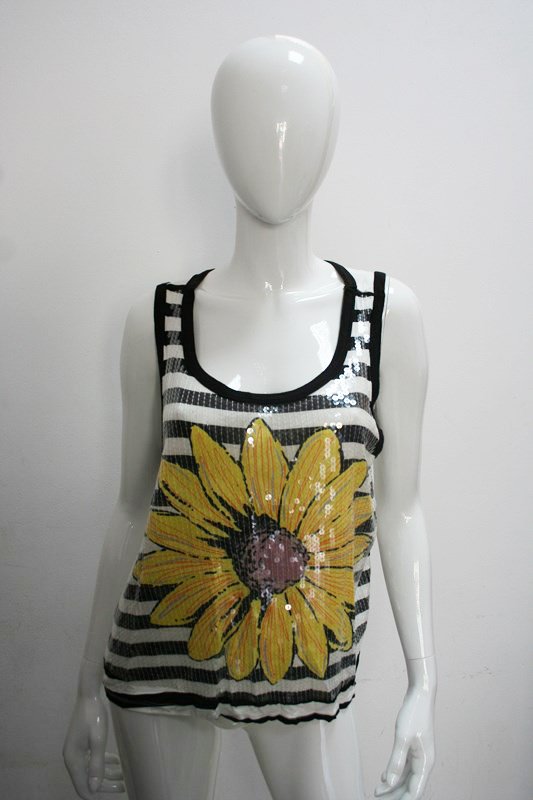 River Island Oryginalna koszulka. Tył biały, przód pokryty przeźroczystymi cekinami i zadrukowany paski i żółty kwiaty. Elastyczna