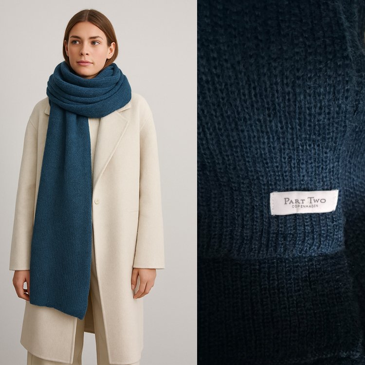 Part Two Copenhagen, szalik Part Two, wełniany szalik, szalik premium, premium scarf, wool blend scarf, mohair blend scarf, dzianinowy szal, open knit scarf, teal scarf, petrol scarf, niebieski szal, zimowy szal, ciepły szal, skandynawska moda, minimalistyczny styl, capsule wardrobe, cosy knit, SveaPW Scarf, oversized scarf, long scarf