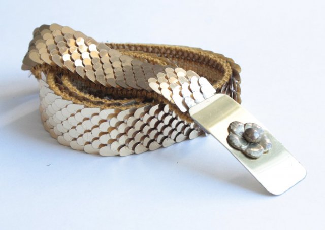 Pasek o z metalowych łusek, od spodu podszyty gumą. Pasek jest elastyczny i ładnie podkreśla talię. Drobne ślady użytkowania widoczne na zdjęciu.