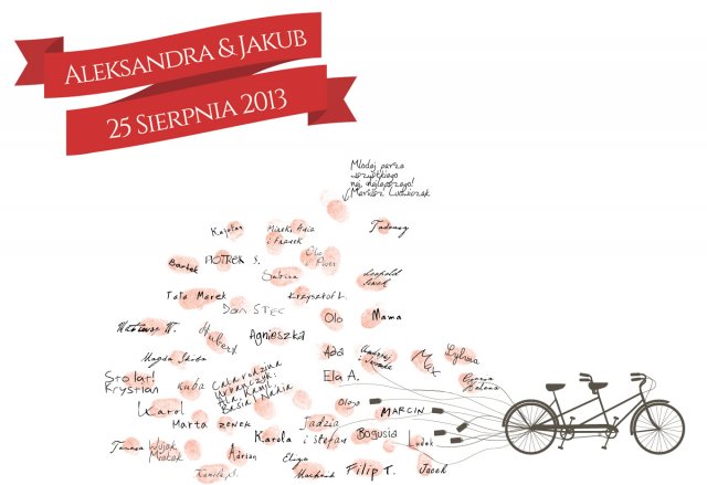 Jest to unikalny, spersonalizowany obraz. Na obrazie podana jest data Waszego ślubu oraz imiona pary młodej. Odciski palców tworzą puszki przyczepione do rowera. Do plakatu dołączona jest instrukcja dla gości oraz 3 tusze (miętowy, różowy, morski, łososiowy).