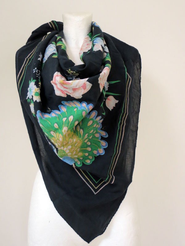 Bardzo duża chustka vintage. Motyw kwiatów,ptaków[pawi] na czarnym tle.Napis:YIN. Podwijana maszynowo.