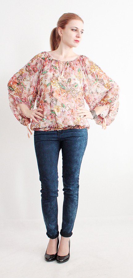 Piękna,absolutnie wyjątkowa bluzka francuskiej marki Miss June. Bluzka o fasonie typu oversize, oprószona barwnymi cekinami. Dekolt i mankiety wykończone chwostami z frędzelkami. Tkanina jest półtransparentna. Na dole wszyte gumki.