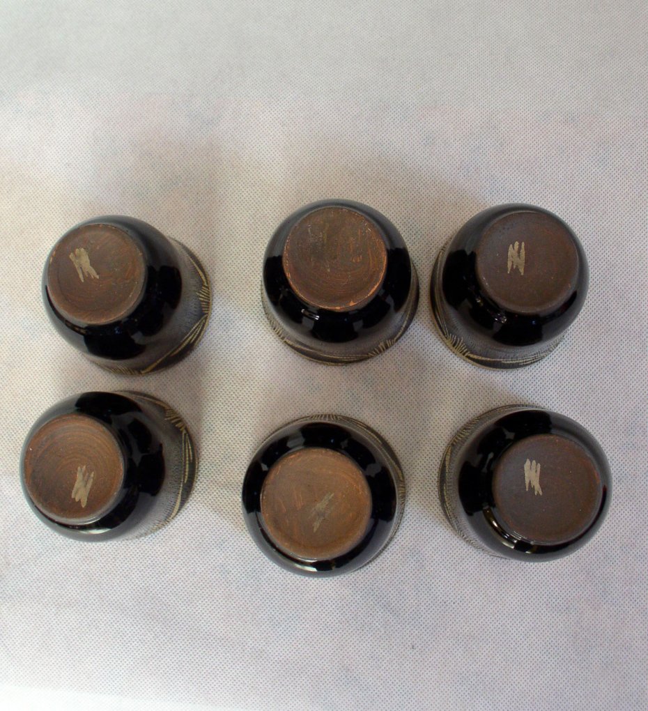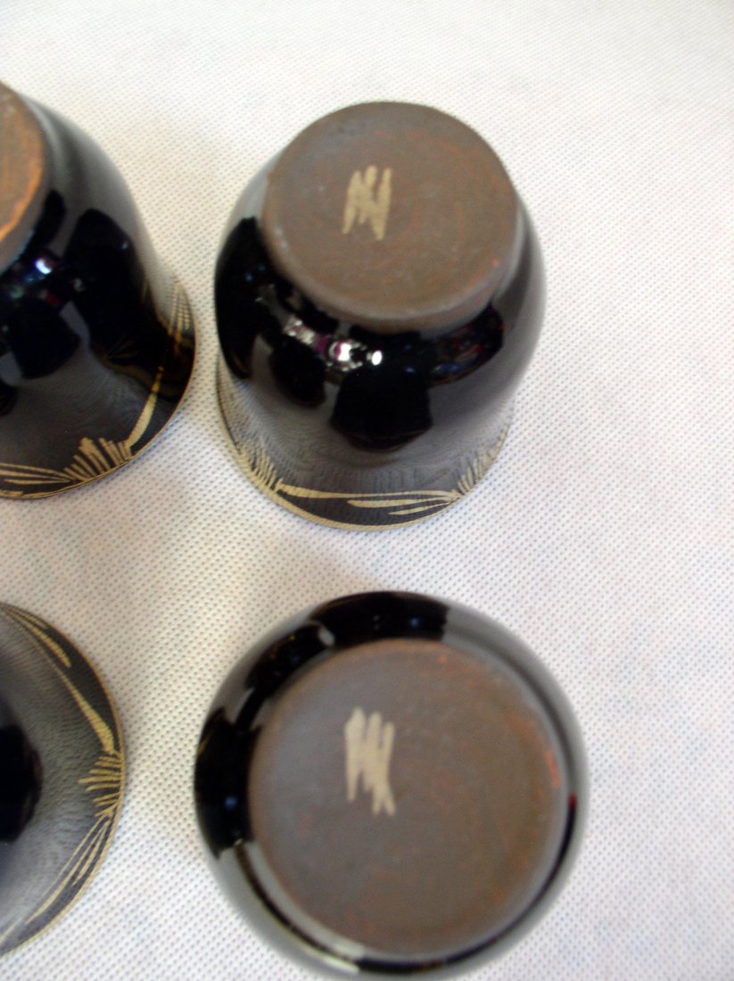Kolor ciemny granat, prawie czarny. Ozdobione złotym wzorem, na dnie znak firmowy malowany złotą farbą.