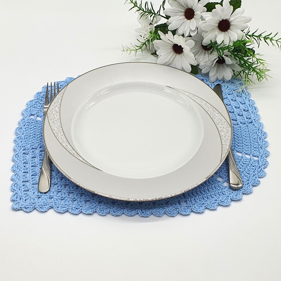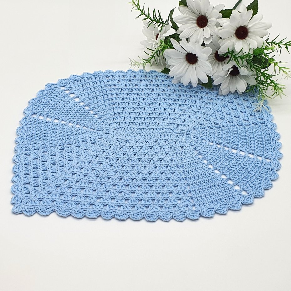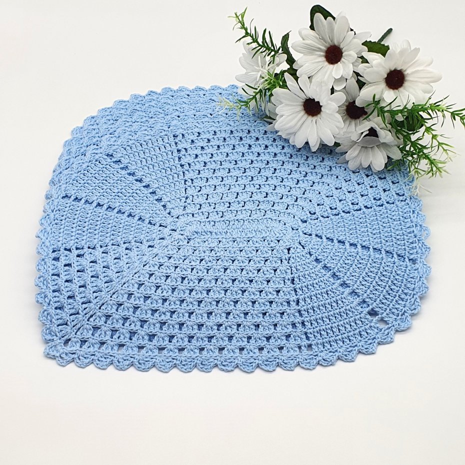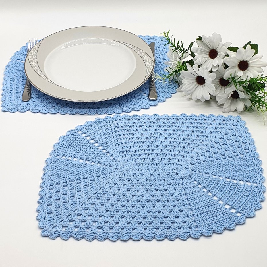 Komplet 6 podkładek pod talerz, w kolorze niebieskim (błękitnym), o nietypowym kształcie, wykonany na szydełku z grubego kordonka, 38 cm x 27 cm