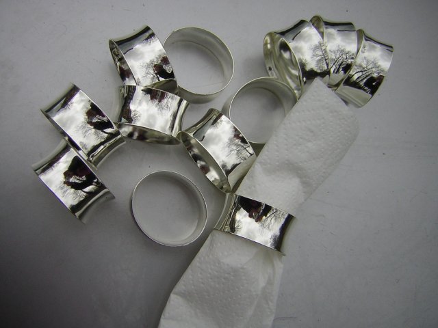 Komplet serwetnikow.Nie sygnowany, ale bardzo dobrze wykonane . Ciekawa forma, wykończenie metalu błyszczące z zewnątrz, wewnątrz satynowe. Eleganckie , dekoracyjne, oryginalne. 5 x trochę ponad 4 cm x 2,5 cm
