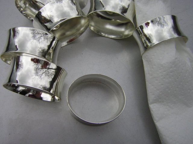 Komplet serwetnikow.Nie sygnowany, ale bardzo dobrze wykonane . Ciekawa forma, wykończenie metalu błyszczące z zewnątrz, wewnątrz satynowe. Eleganckie , dekoracyjne, oryginalne. 5 x trochę ponad 4 cm x 2,5 cm