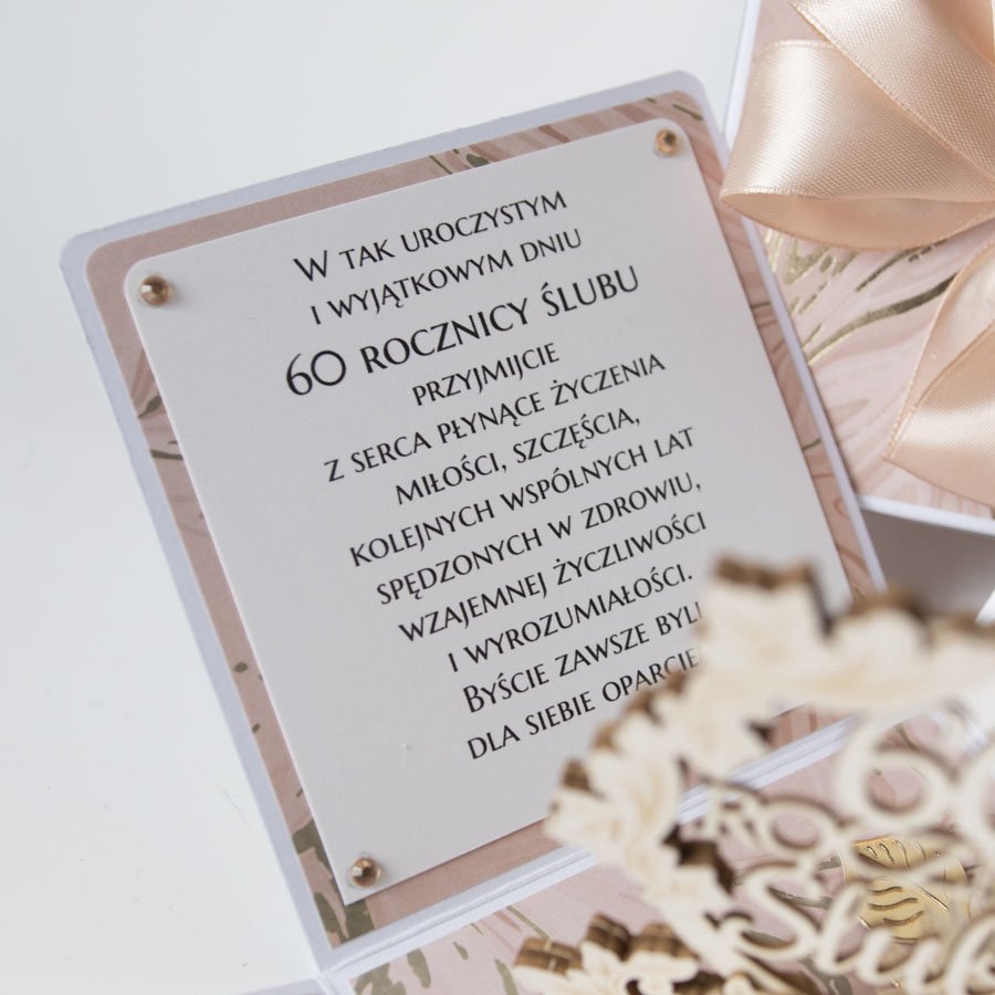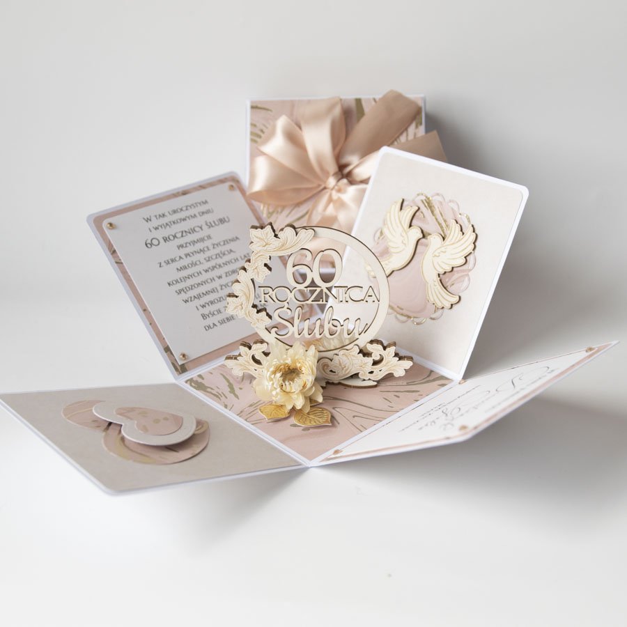 Ręcznie robiona kartka z okazji 60 rocznicy ślubu w formie rozkładanego pudełeczka.