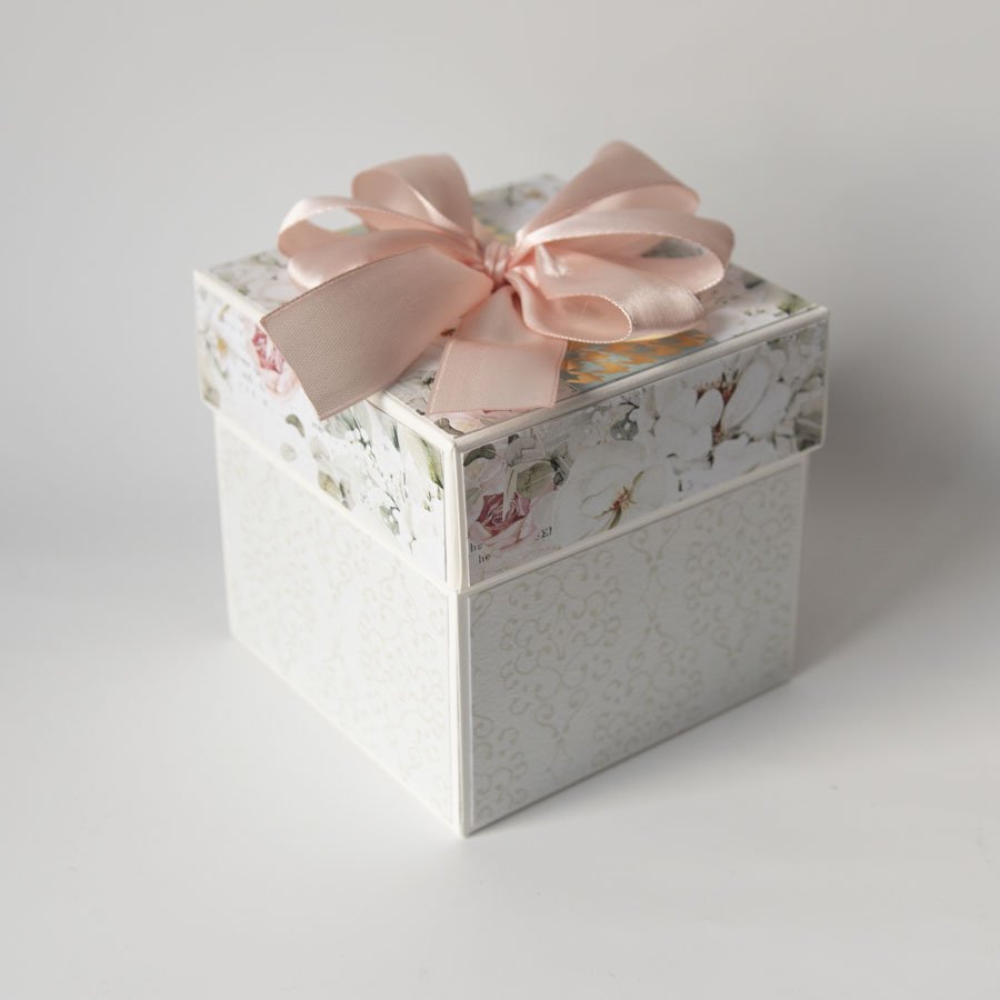 Na środku pudełeczka znajduje się dekoracja z papierowymi kwiatuszkami, na ściankach motyw serca, życzenia dla solenizantów, miejsce na podpis oraz splecione ze sobą obrączki.