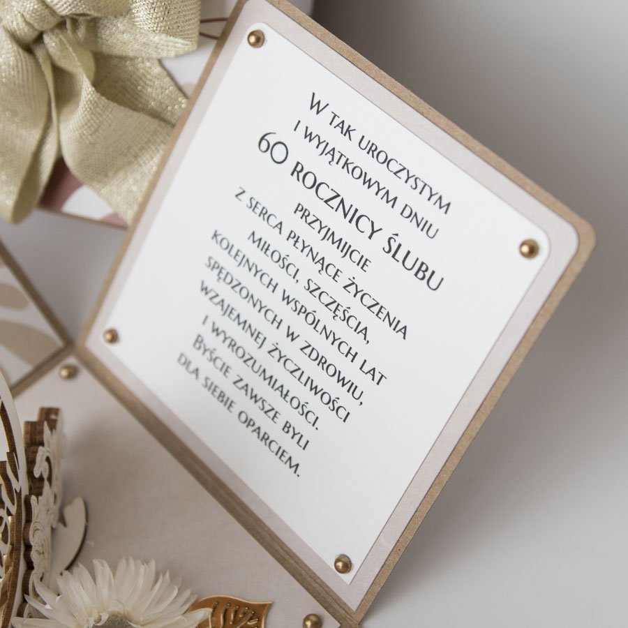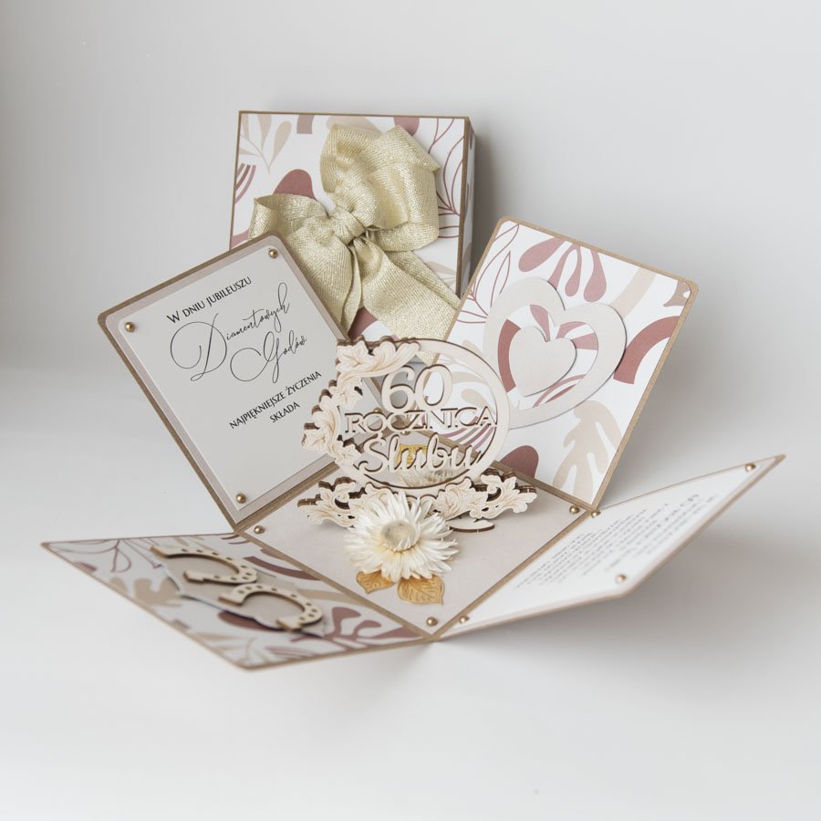 Ręcznie robiona kartka z okazji 60 rocznicy ślubu w formie rozkładanego pudełeczka.