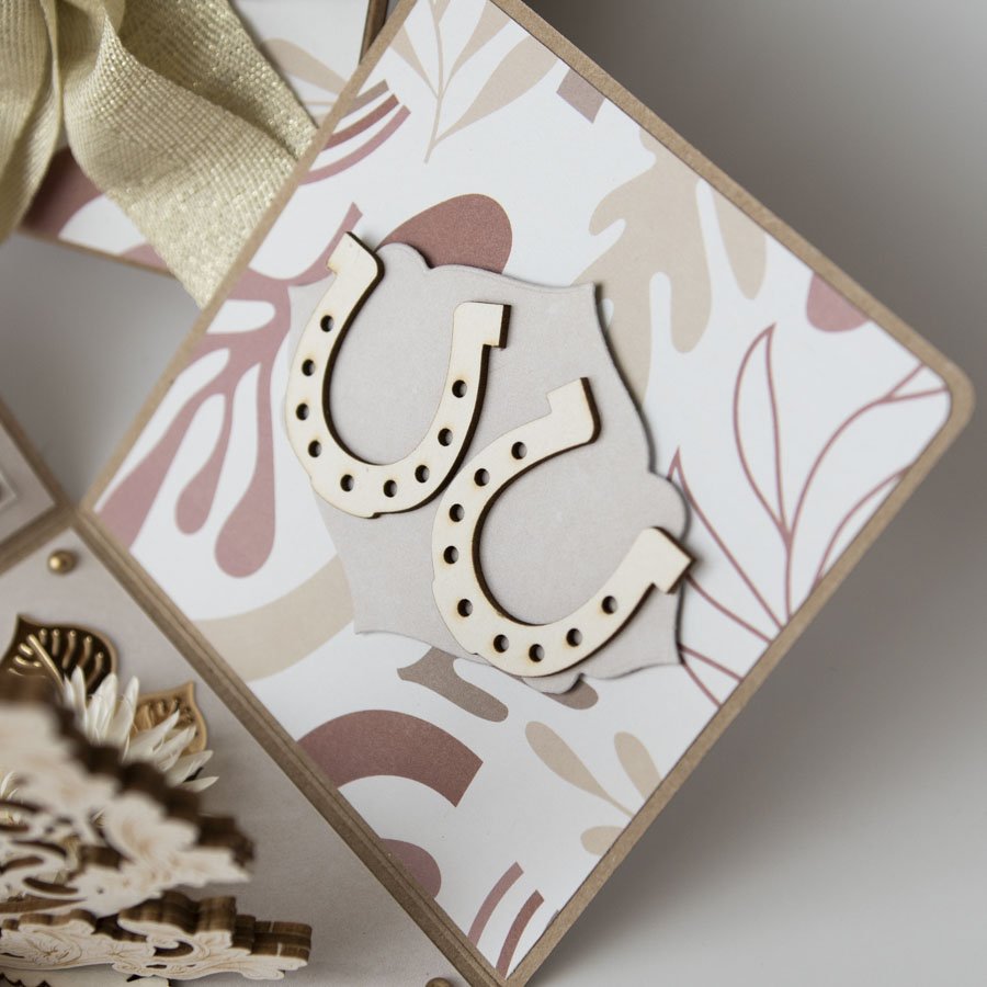 Na środku pudełeczka znajduje się dekoracja z papierowymi kwiatuszkami, na ściankach motyw serca, życzenia dla solenizantów, miejsce na podpis oraz dwie podkowy na szczęście