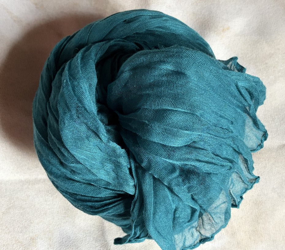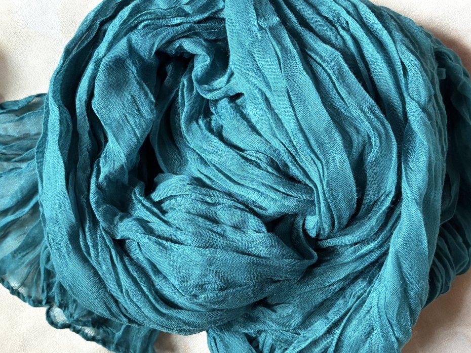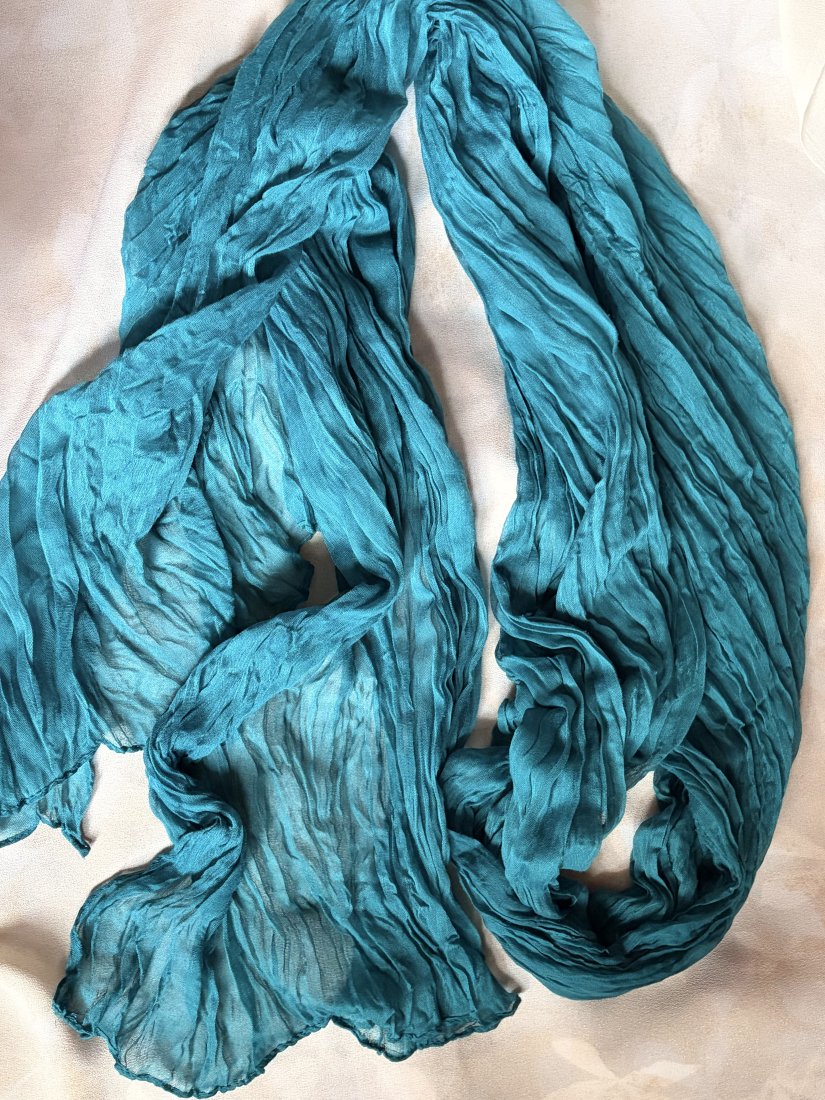 Bardzo długi , gnieciony , luźno tkany bardzo miły w dotyku szal - mgiełka . Niesamowity szafirowy kolor ( najbliżej rzeczywistości na pierwszym i ostatnim zdjęciu ) szerokość bez rozciągania około 70 cm długość około 295 cm . Bardzo lekki i efektowny . Brak metki ze składem , ale z całą pewnością jest to materiał naturalny . Stan zachowania bardzo dobry - brak metek .