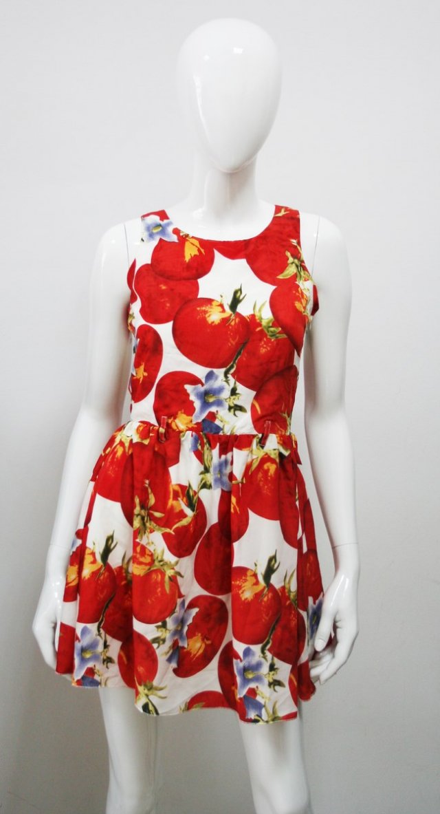 Bardzo oryginalna sukienka z delikatnego materiału, w pomidory. Tył z odkrytymi plecami. Zapinana z boku na zamek. Szlufki. Sukienka z podszewka.