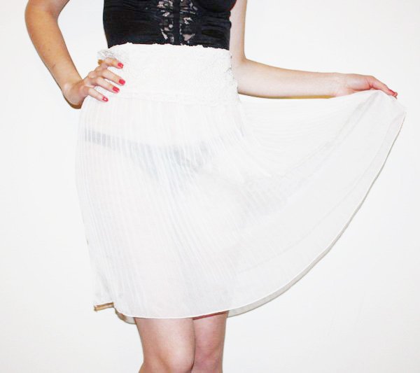 Proszę zwrócić uwagę, że zdjęcie jest robione w trybie czarno-białym, natomiast spódnica jest jasnokremowa a nie biała, jak mogłoby wydawać się na zdjęciach.