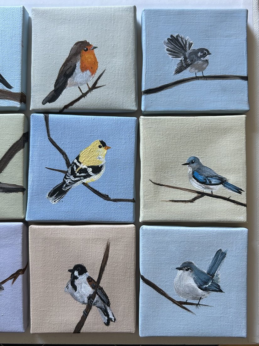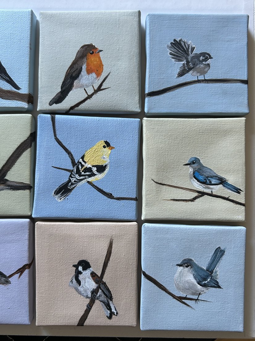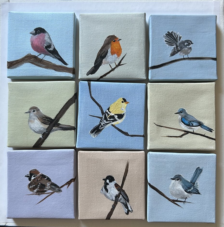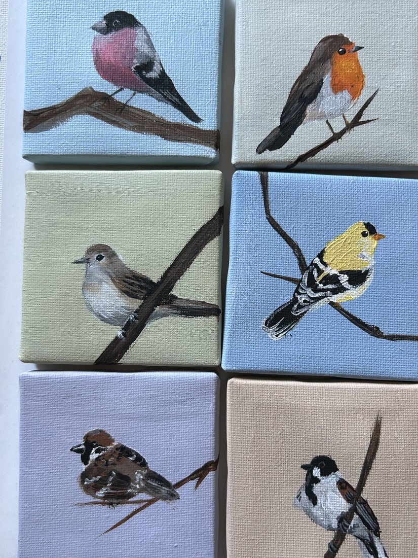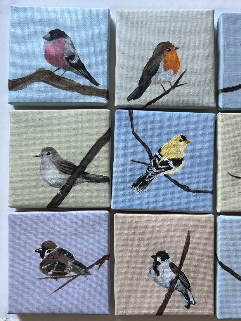 zestaw 9 obrazków ptaszków, ręcznie malowanych farbami akrylowymi, 7x7cm