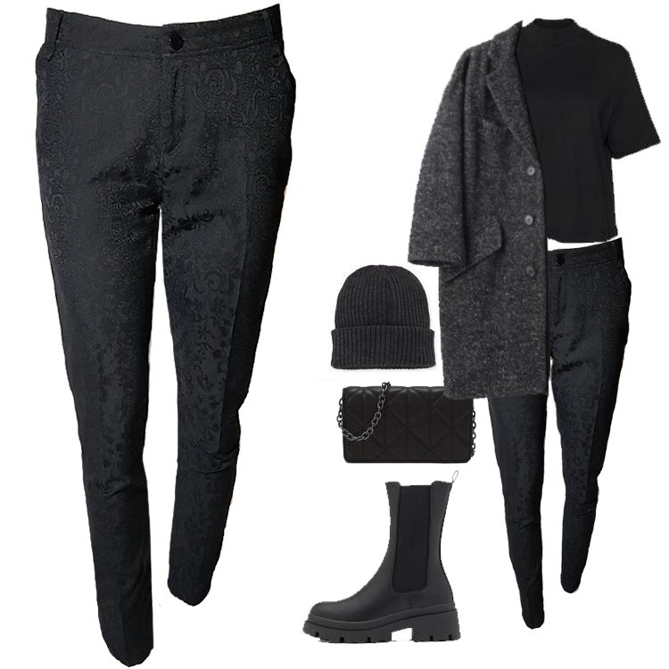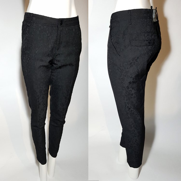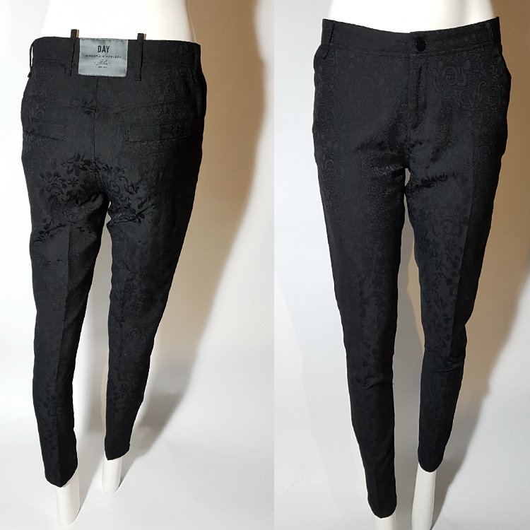 Spodnie damskie luksusowej skandynawskiej marki DAY Birger et Mikkelsen. Wykonane z żakardu w ornamentowy  koronkowy wzór. Krój cygaretek, nogawki zwężane do dołu, z kantem, z przodu kieszenie, pas z szlufkami, spodnie zapinane na zamek, z tyłu kieszenie z patkami.
