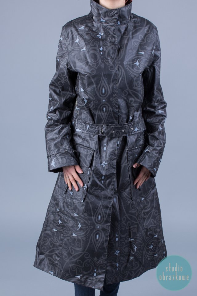 Trencz jest świetnie skrojony, w pasie wiązany, posiada podszewkę, warstwa wierzchnia nieprzemakalna.