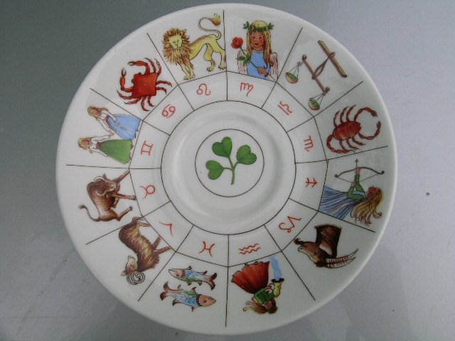 Porcelanowy Talerzyk sygnowany ROYAL KENDALL Fine Bone China Made in England H & M Ltd. 1985. Dość głęboki jak na niezbyt wielki talerzyk. Bardzo ciekawie zdobiony znakami zodiaku. Żywe kolory na białej porcelanie na błyszcząco szkliwione. Rysunki wyglądają jak odręczną kreską kreślone...piękne i symboliczne...Użytkowy,dekoracyjny,nadaje się na prezent :)
