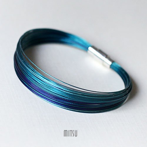 A SEA...HAVE NEITHER MEANING NOR PITTY Minimalistyczna bransoleta zapinana na magnes i blokadę, zbudowana z kaskady linek stalowych krytych nylonem. Linki w odcieniach turkusu, kobaltu i lazuru. Opakowanie wykonane ręcznie. Rozmiar: 20 cm Rozkład linek może się nieznacznie różnić od tego na zdjęciu.