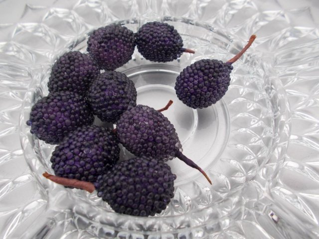 13 sztuk OWOCKÓW całych szklanymi koralikami wylepianych. Pięknie połyskujący, światło lubiący Fiolet. Ogonki druciane. Urocza dekoracja i ozdoba.