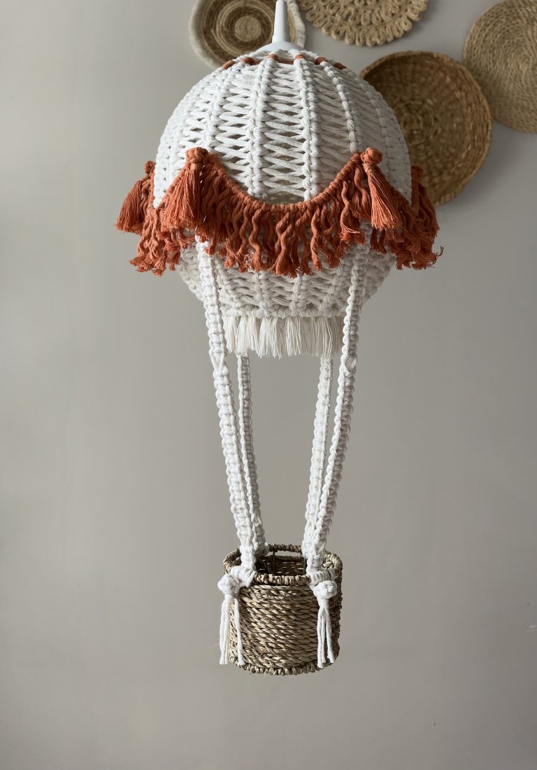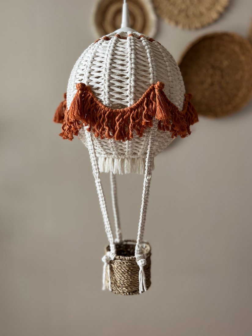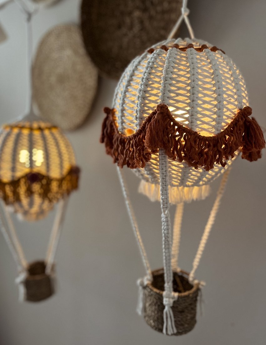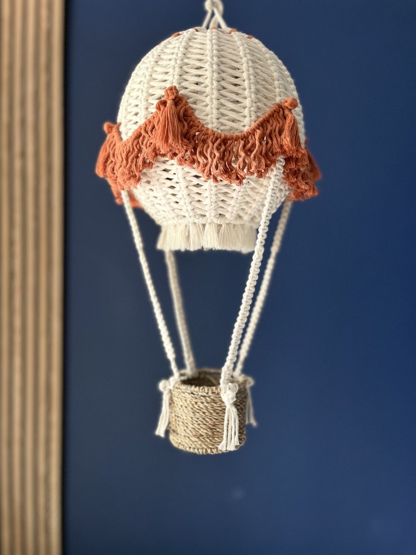 Magiczny abażur makramowy w kształcie balonu latającego, który wnosi do wnętrza ciepło, lekkość i nutę dziecięcej wyobraźni