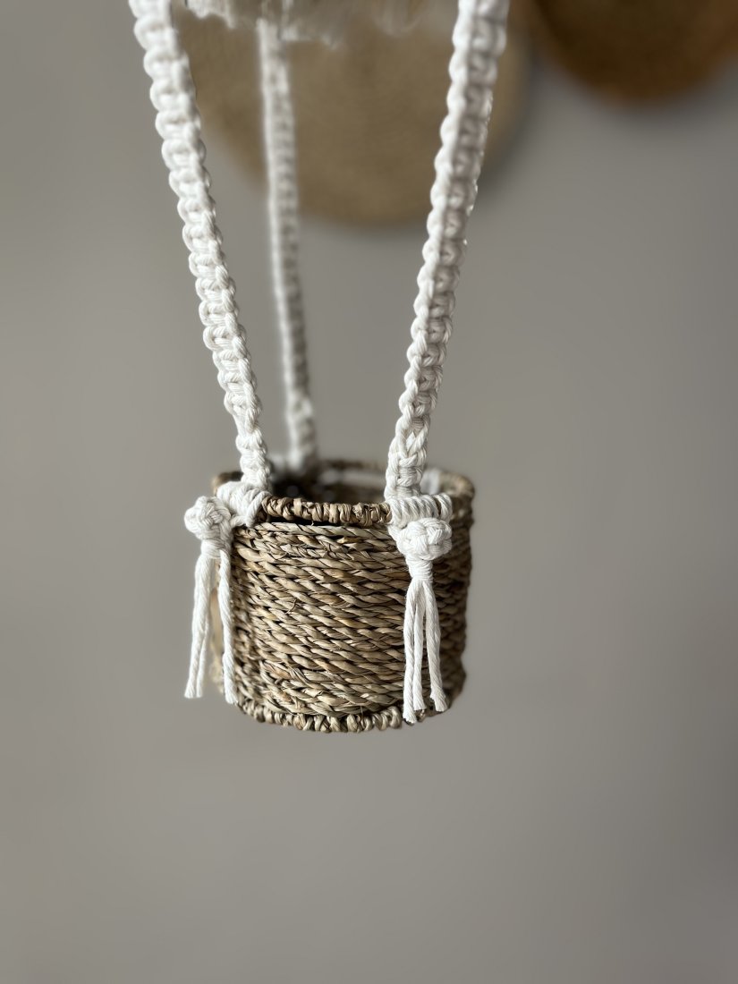 Abażur zachwyca plecioną strukturą ze sznurka bawełnianego, subtelnymi frędzlami oraz koszykiem inspirowanym prawdziwym balonem na ogrzane powietrze. To dekoracja, która pięknie prezentuje się zarówno w ciągu dnia, jak i po zapaleniu światła – tworząc przytulny, kojący klimat.