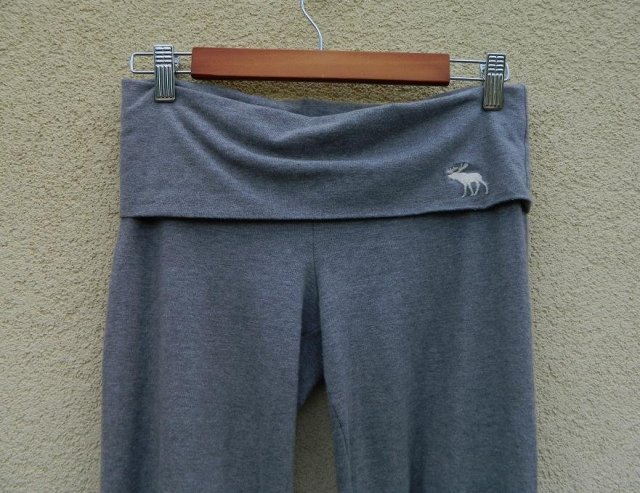 Świetne spodnie Abercrombie & Fitch, dedykowane jak w tytule. Niezbyt gruba, super sprężysta dzianina w kolorze średniego szarego melanżu. Bawełna z elastanem, super dopasowują się do sylwetki, biodrówki (pas można wywinąć dowolnie).