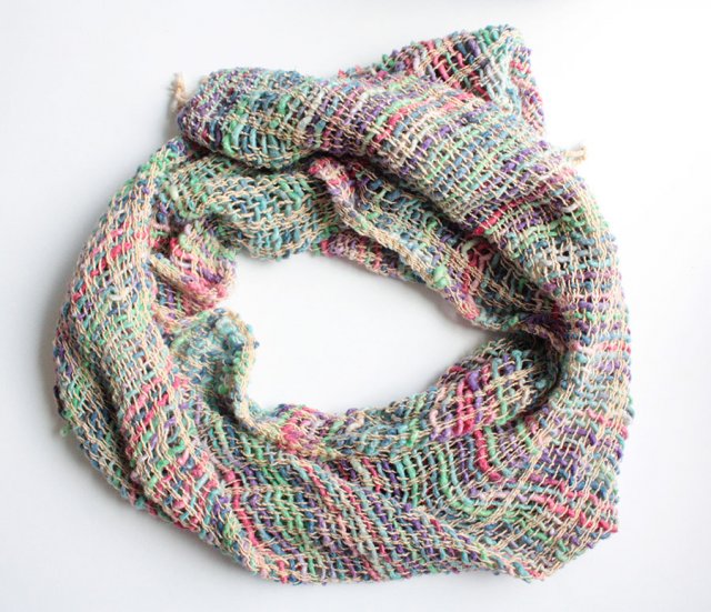 Miękki kolorowy szal o oryginalnej strukturze. Materiał to prawdopodobnie bawelna lub wiskoza.