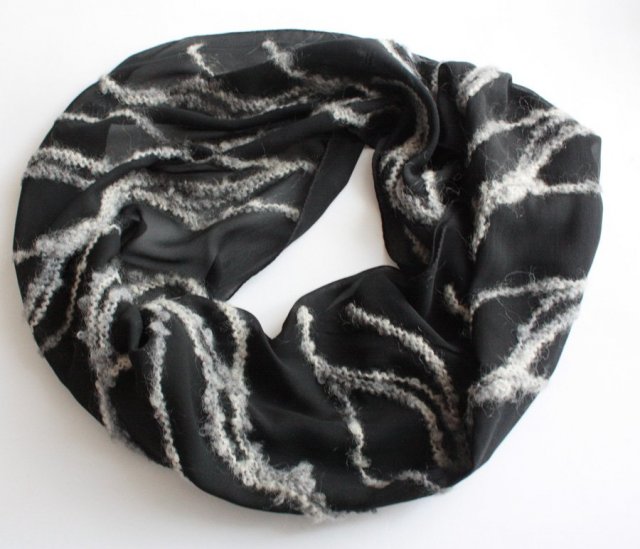 Wspaniały szal o zwracający uwagę wyjątkowym połączeniem tekstur: na cienki, zwiewny, półprzezroczysty materiał (prawdopodobnie jedwab) naszyto w fantazyjny sposób puszytą włóczkę.