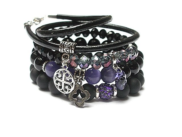 ******** PRAWA AUTORSKIE ********* Nowa odsłona naszych setów - "ACCENT POINT SET" - neutralne, stonowane tło i akcent kolorystyczny jako tylko mały punkt. W tym przypadku akcentem jest kolor fioletowy. Komplet czterech bransoletek wykonanych z naturalnych kamieni: black stone matowy [10mm],onyks [10mm], uleksyt [10mm], kryształków fasetowanych [8 x 6mm], przekładki shamballa wysadzanej kryształkami Swarovskiego, przywieszki z kryształkiem Swarovskiego, przywieszki ze stali szlachetnej, rzemienia z naturalnej skóry oraz elementów metalowych w kolorze srebra. Bransoletki pasują na nadgarstek 16-17cm. Biżuteria ozdobnie zapakowana