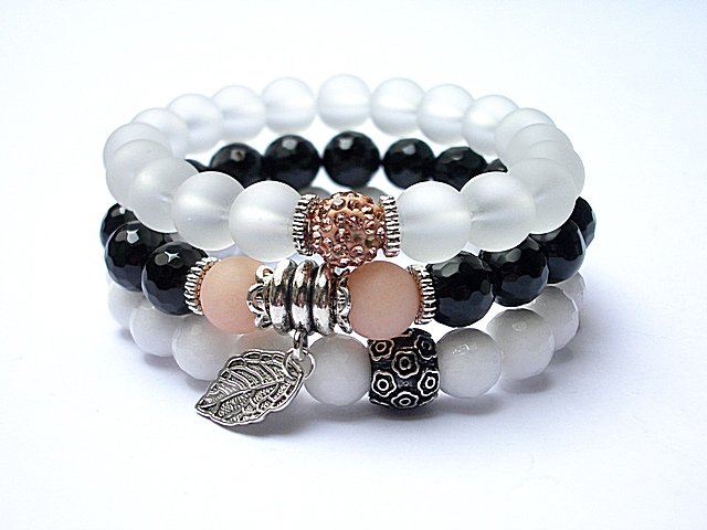 ******** PRAWA AUTORSKIE ********* Nowa odsłona naszych setów - ACCENT-POINT SET - neutralne ,stonowane tło i akcent kolorystyczny jako tylko mały punkt . W tym przypadku akcentem jest kolor brzoskwiniowy Komplet trzech bransoletek wykonanych z matowego szkła [10mm], onyksu fasetowanego [10mm], jadeitów [10mm], przekładki shamballa wysadzanej kryształkami Swarovskiego oraz elementów metalowych w kolorze srebra. Bransoletki pasują na nadgarstek 16-17cm. Biżuteria ozdobnie zapakowana