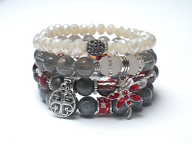 ******** PRAWA AUTORSKIE ********* Nowa odsłona naszych setów - "ACCENT-POINT SET" - neutralne ,stonowane tło i akcent kolorystyczny jako tylko mały punkt . W tym przypadku akcentem jest kolor czerwony. Komplet czterech bransoletek wykonanych z naturalnych kamieni: hematyt matowy [10mm], agat wysadzany cyrkoniami [10mm], kwarc czerwony [10mm], marmur [10mm], kryształków fasetowanych [6 x 8mm], szkła [10mm] kuleczki shamballa wysadzanej kryształkami Swarovskiego, efektownej przywieszki wysadzanej kryształkami oraz elementów metalowych w kolorze srebra. Bransoletki pasują na nadgarstek 16 - 17cm. Biżuteria ozdobnie zapakowana