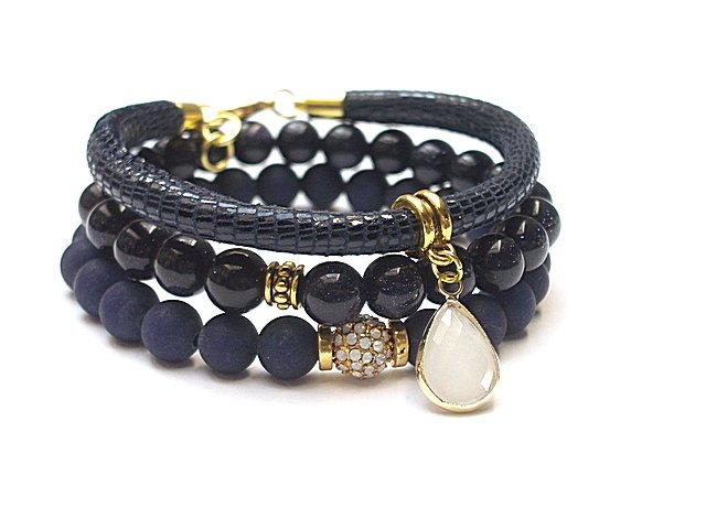 ******** PRAWA AUTORSKIE ********* Nowa odsłona naszych setów - "ACCENT-POINT SET" - neutralne ,stonowane tło i akcent kolorystyczny jako tylko mały punkt . W tym przypadku akcentem jest kolor mleczny . Komplet trzech bransoletek wykonanych z naturalnych kamieni:matowe jadeity [8mm] ,kuleczki nocy kairu [8mm] ,ekskluzywnej przekładki z miedzi pozłacanej i wysadzanej cyrkoniami [8mm] ,zawieszki w okuciu ,skórzanego rzemienia ze skórki cielęcej o wężowym wzorze [6mm] oraz elementów w kolorze złota. Bransoletki pasują na nadgarstek 16-17cm. Biżuteria ozdobnie zapakowana