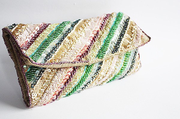 Cekinowa kopertówka (lub duży portfel) zapinana na zatrzask. Posiada atlasową podszewkę i kieszonkę w środku.