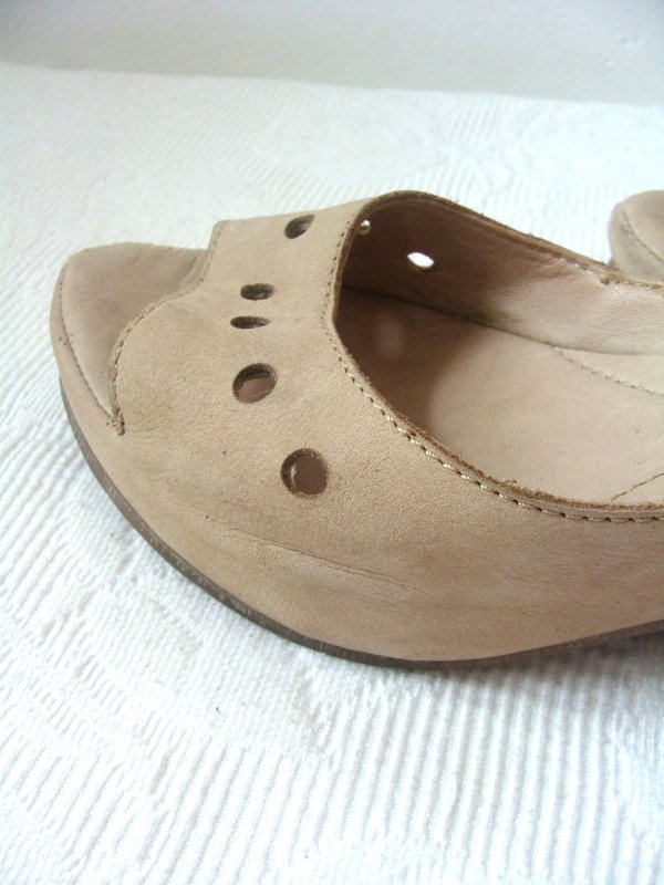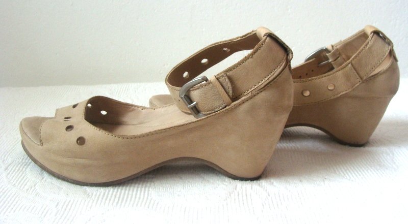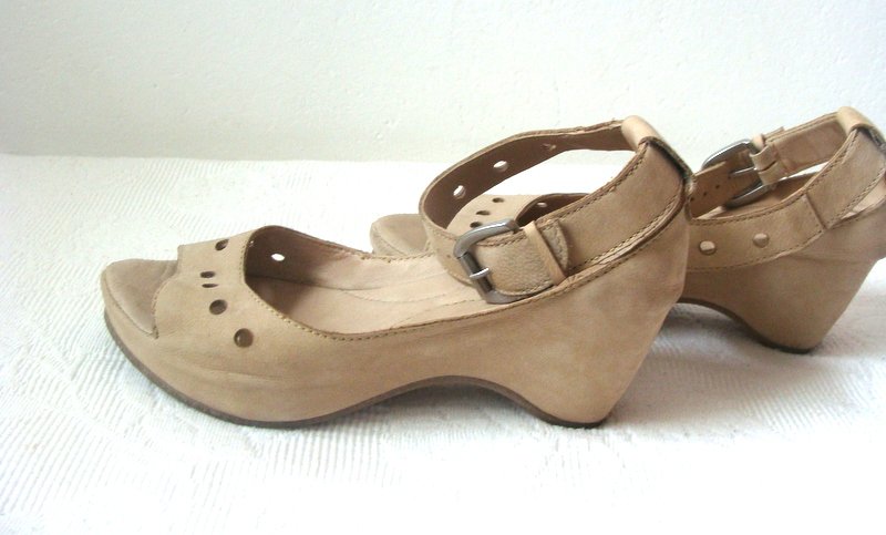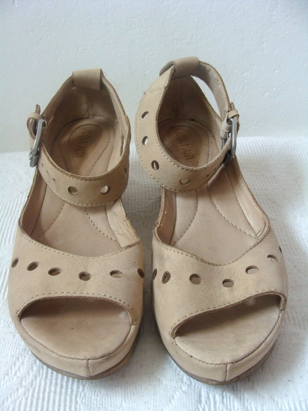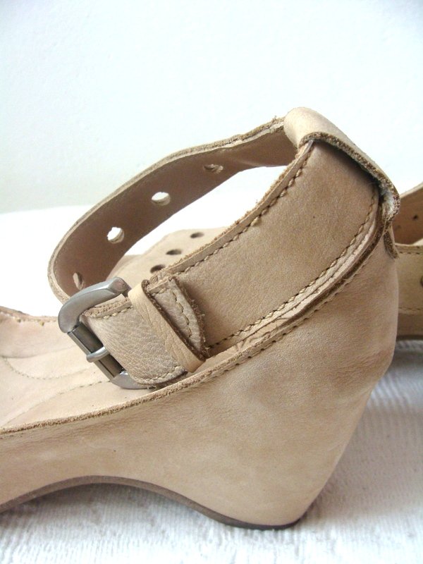 Bardzo wygodne sandały z miękkiej skóry naturalnej w jasnobeżowym kolorze na pograniczu z nude. Na wygodnej koturnie, z zapinanym wokół kostek pasku.