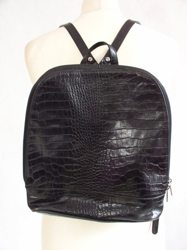 Czarny ,mały plecak,firmy ADAX.Materiał skóra naturalna.Podszewka syntetyk w romby z logo firmy.W środku jedna komora+kieszonka na zamek.Od strony pleców kieszonka na zamek+logo firmy.Dwa paski regulowane.Stan dobry+spód na brzegach lekko wytarty.Wysokość 29 cm.szerokość 30 cm.