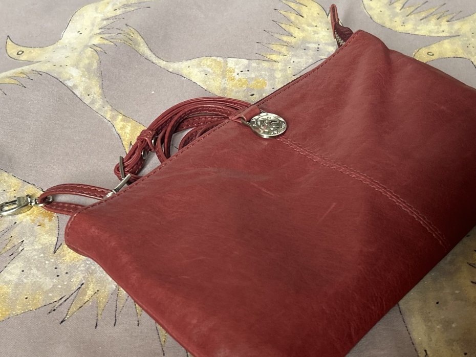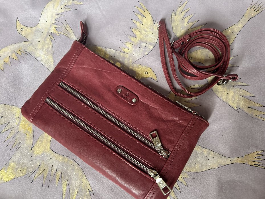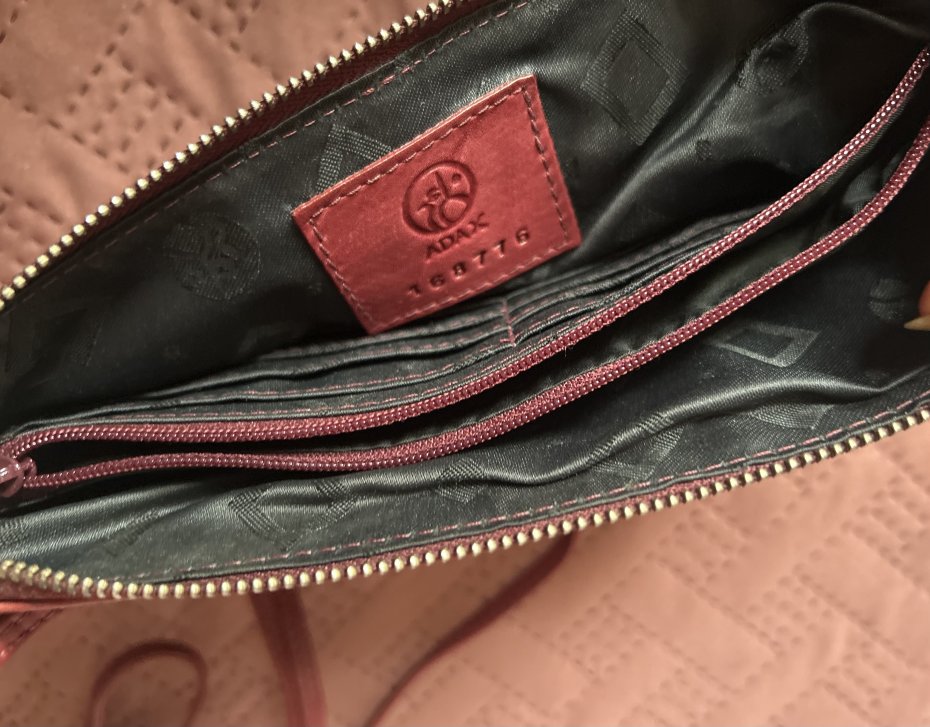 Fantastyczna, nieduża skórzana torebka z odpinanym długim paskiem . Może służyć jako kopertówka . Logo - ADAX SINCE 1982 cm . Z zewnątrz płytkie kieszonki na suwak . Wewnątrz jedna duża i niewiarygodna ilość przegródek na karty i wizytówki . Jakościowa podszewka i logo na skórze , zapinana na suwak. Wyjątkowo cieniutki pasek z regulacją, który można odpiąć .Ciekawy kolor 24 x 14 pasek 150 x trochę ponad 0,5 cm Stan zachowania -drobne ślady użytkowania - bez żadnych większych wad .